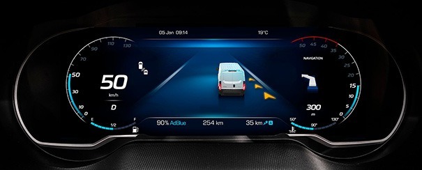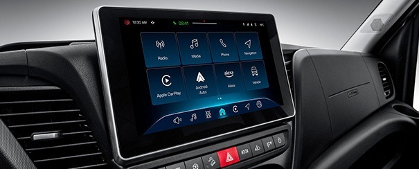 Ciesz się życiem na pokładzie dzięki 10-calowemu kolorowemu wyświetlaczowi o wysokiej rozdzielczości, który jest zintegrowany z deską rozdzielczą. Nawigacja jest prosta i intuicyjna, pozwala na podłączenie smartfona i korzystanie z aplikacji IVECO Driver Pal za pomocą mikrofonu w kabinie.