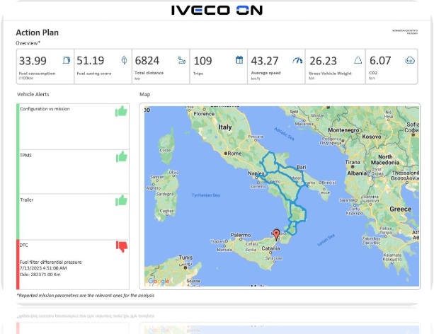 Portal i aplikacja IVECO ON to Twój pulpit do szybkiego sprawdzenia stanu pojazdów. W ramach dostępu możesz uzyskać informacje na temat zużycia paliwa w każdym zarejestrowanym w usłudze pojeździe z Twojej floty, sprawdzić informacje o stylu jazdy kierowców, a także przeczytać wskazówki pozwalające na optymalizację stylu jazdy.